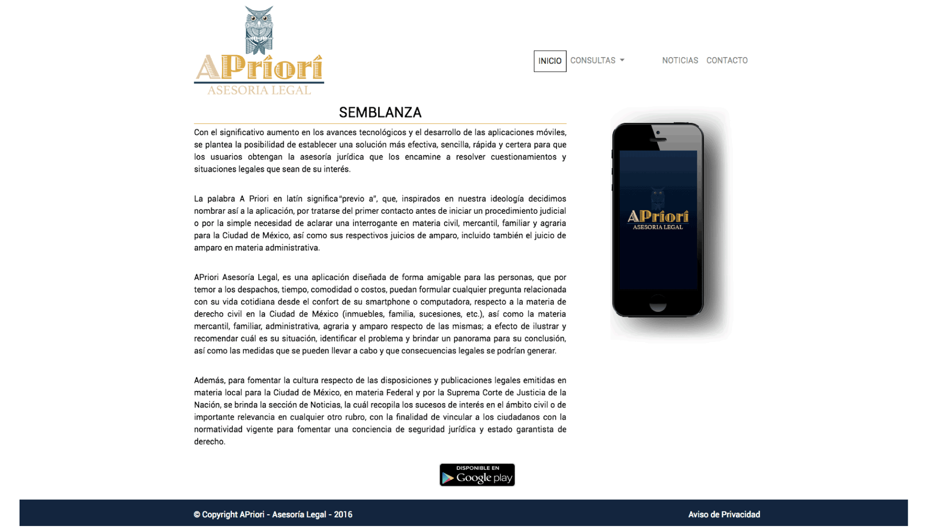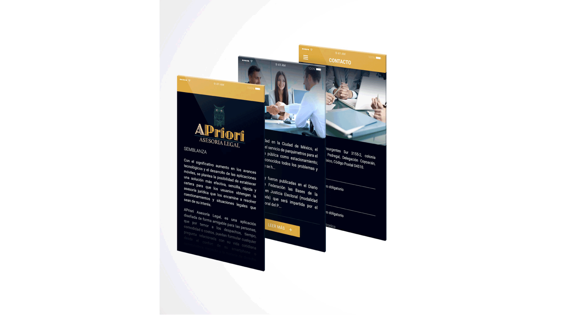 Apriori is a lawyer’s firm which offers an alternative to legal consultations through a mobile app making the process easier, cheaper, and faster. The app offers a detailed legal advice and send it to customer email, additionally has most relevant news related to Mexican Government (“Gaceta Oficial de la Ciudad de Mexico”, “Diario Oficial de la Federeación” and “Suprema Corte de Justicia”).